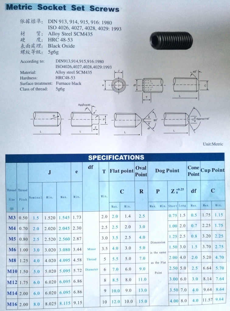 內(nèi)六角凹端緊定,生產(chǎn)標準:DIN916,材質:合金鋼,強度等級:12.9級,螺紋規(guī)格:M2-M24,長度;3mm--100mm